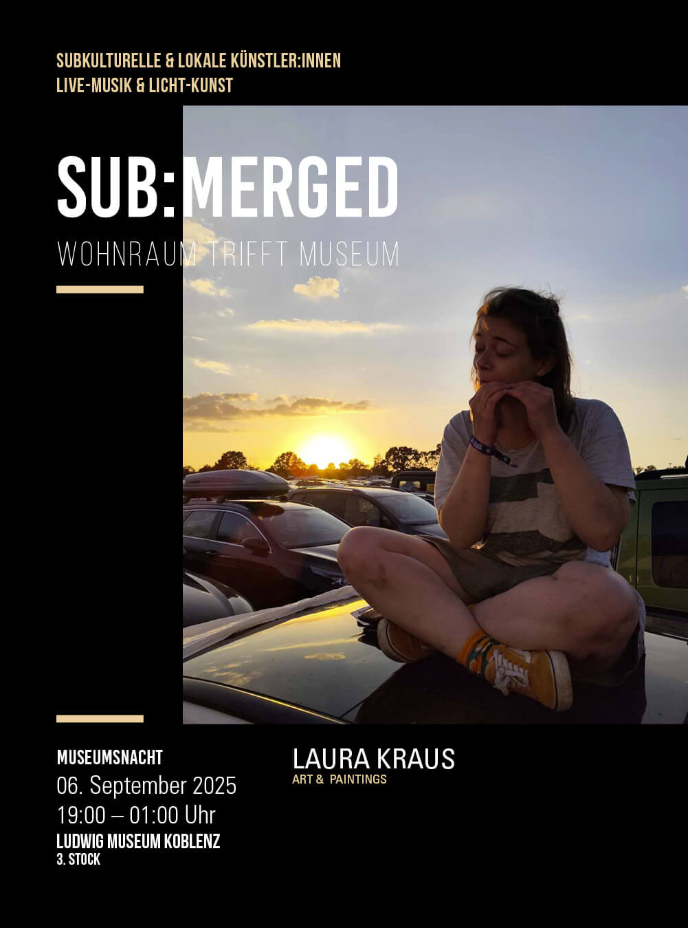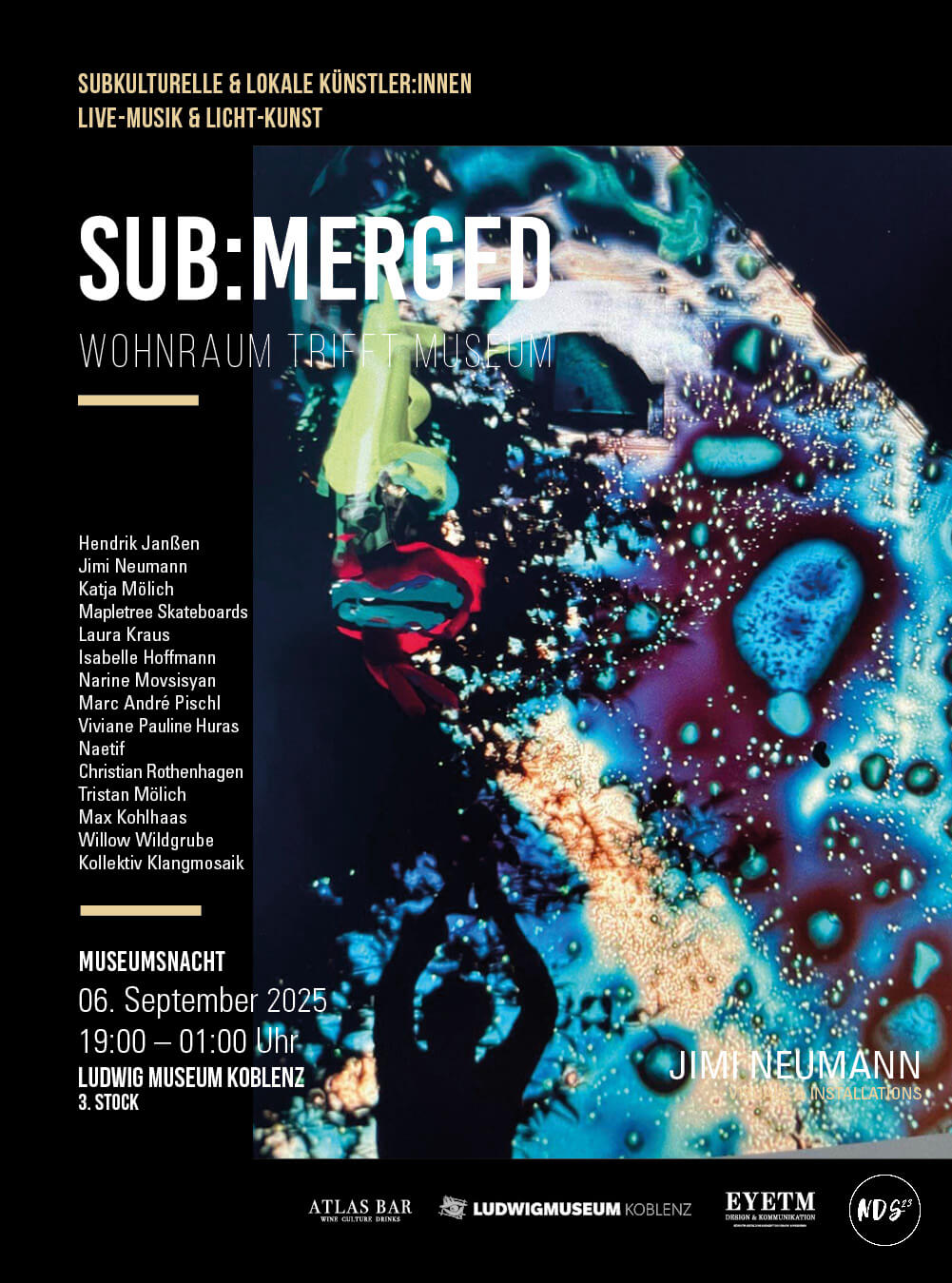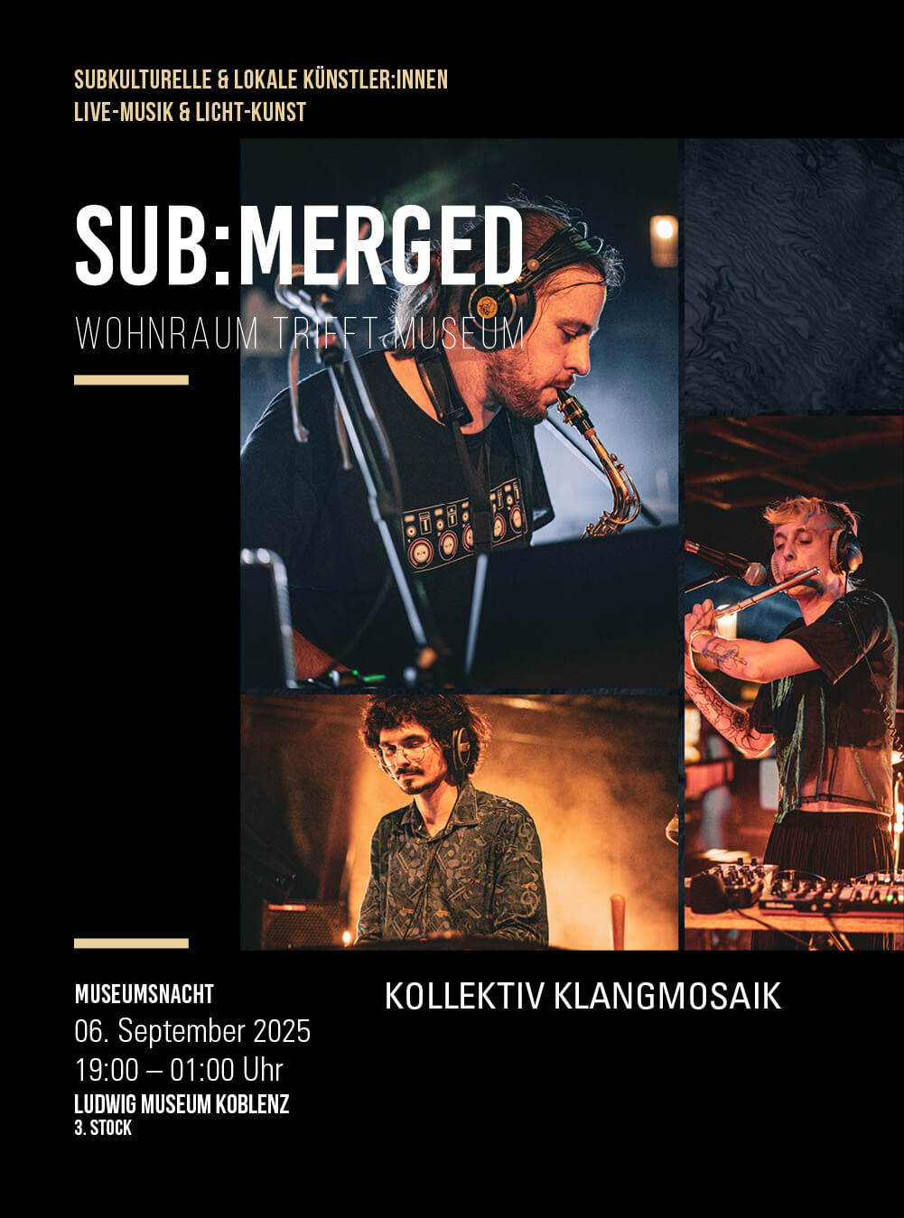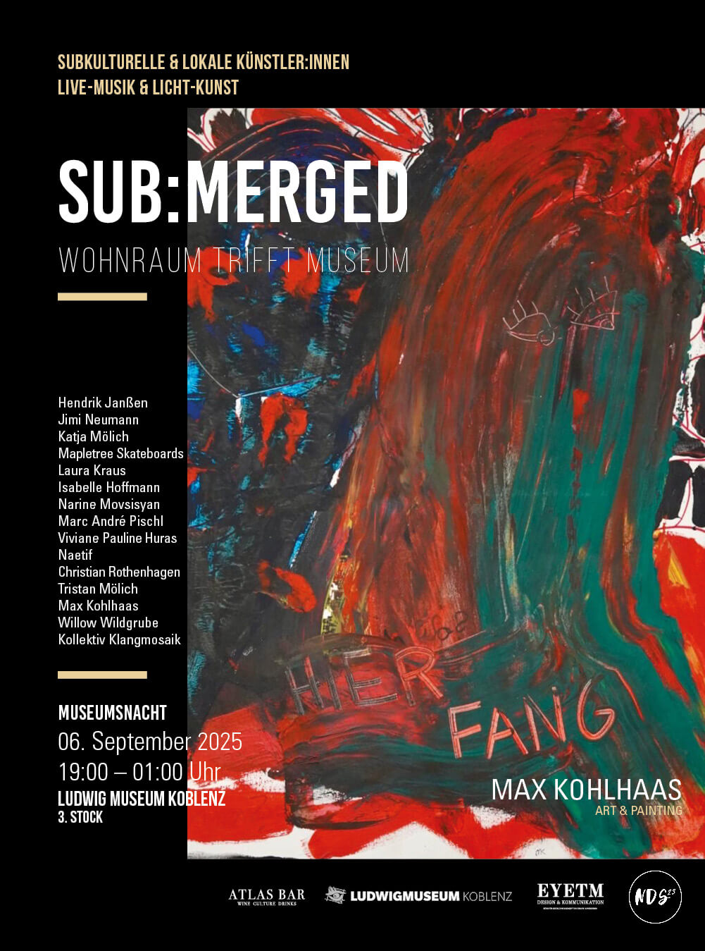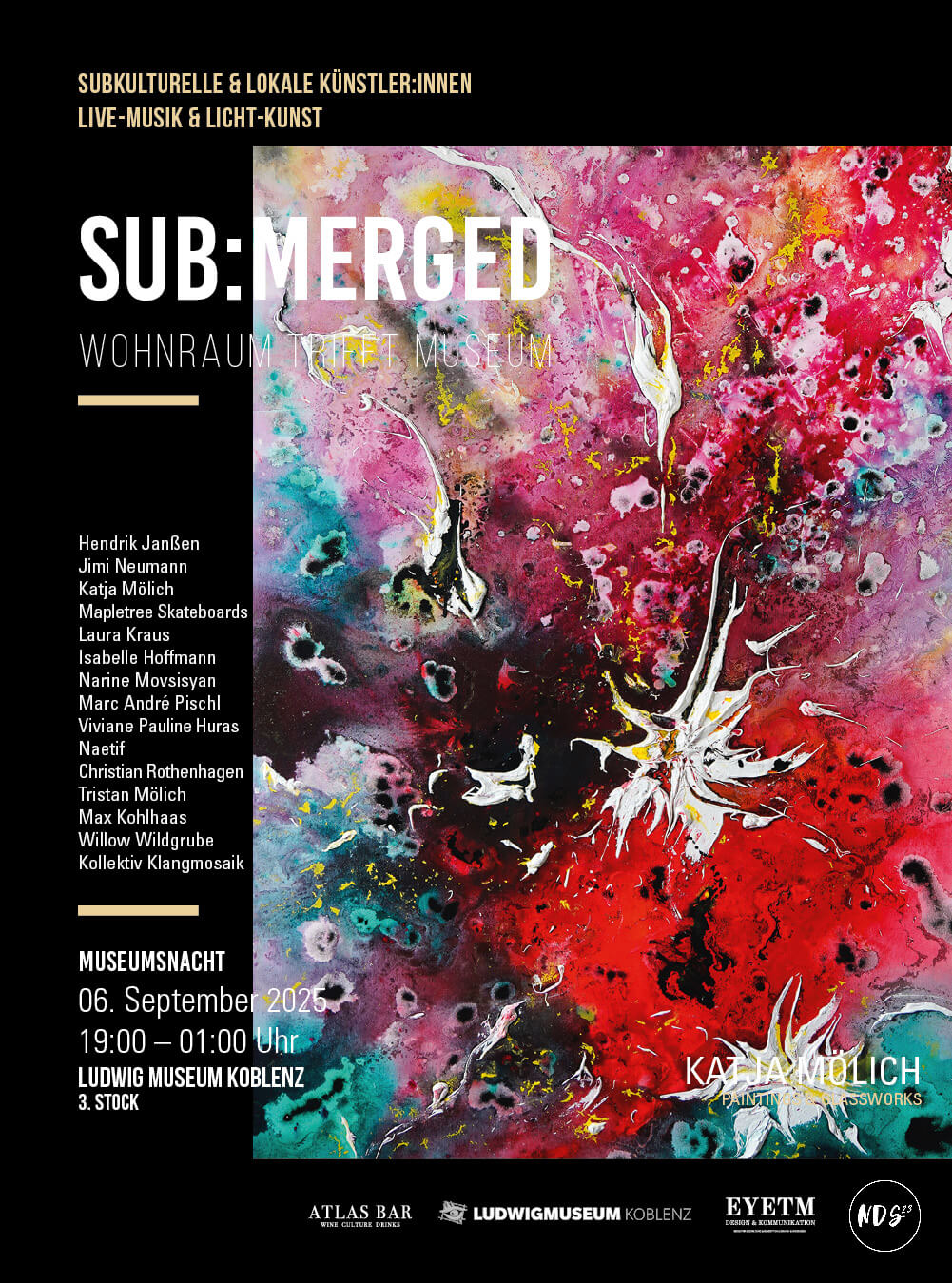 Zur Museumsnacht 2025 verwandelt sich der dritte Stock des Ludwig Museums Koblenz in eine vielschichtige Bühne für subkulturelle und lokale Künstler:innen. Unter dem Titel SUB:MERGED – Wohnraum trifft Museumverschmelzen verschiedene Ausdrucksformen wie Malerei, Fotografie, Glaskunst, Skulptur, Lichtkunst, Musik und Rauminstallation zu einer offenen, zugänglichen Ausstellung auf Zeit.