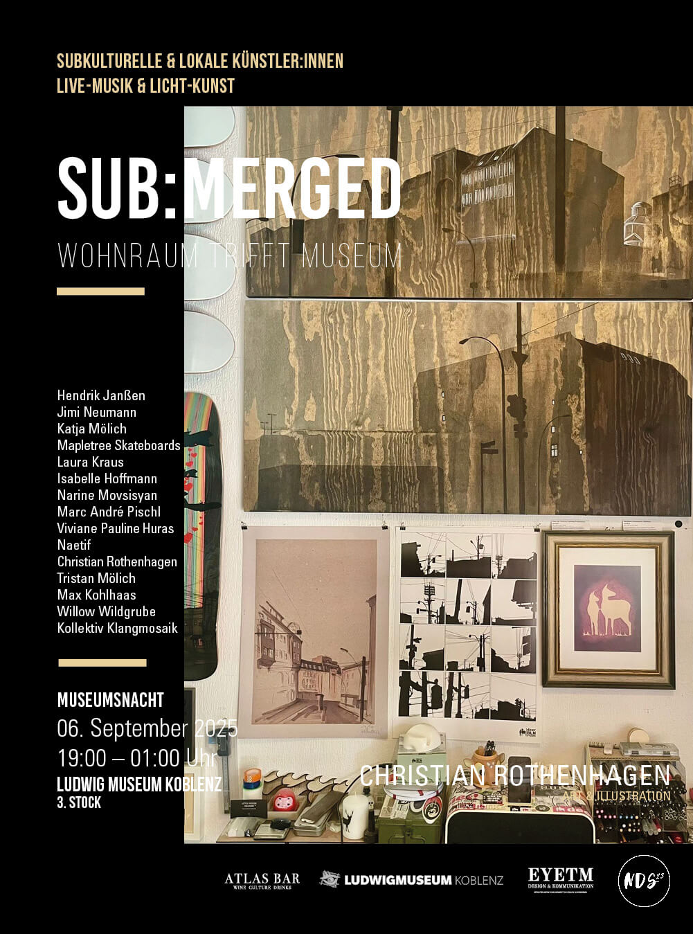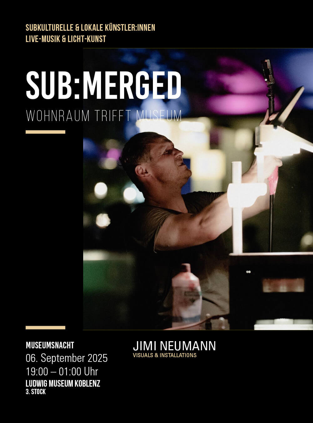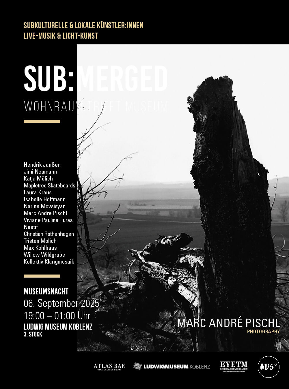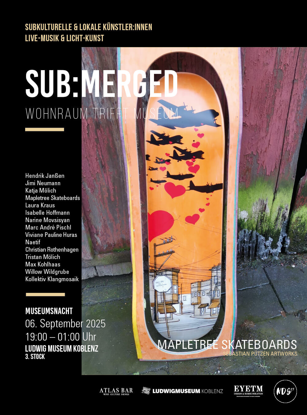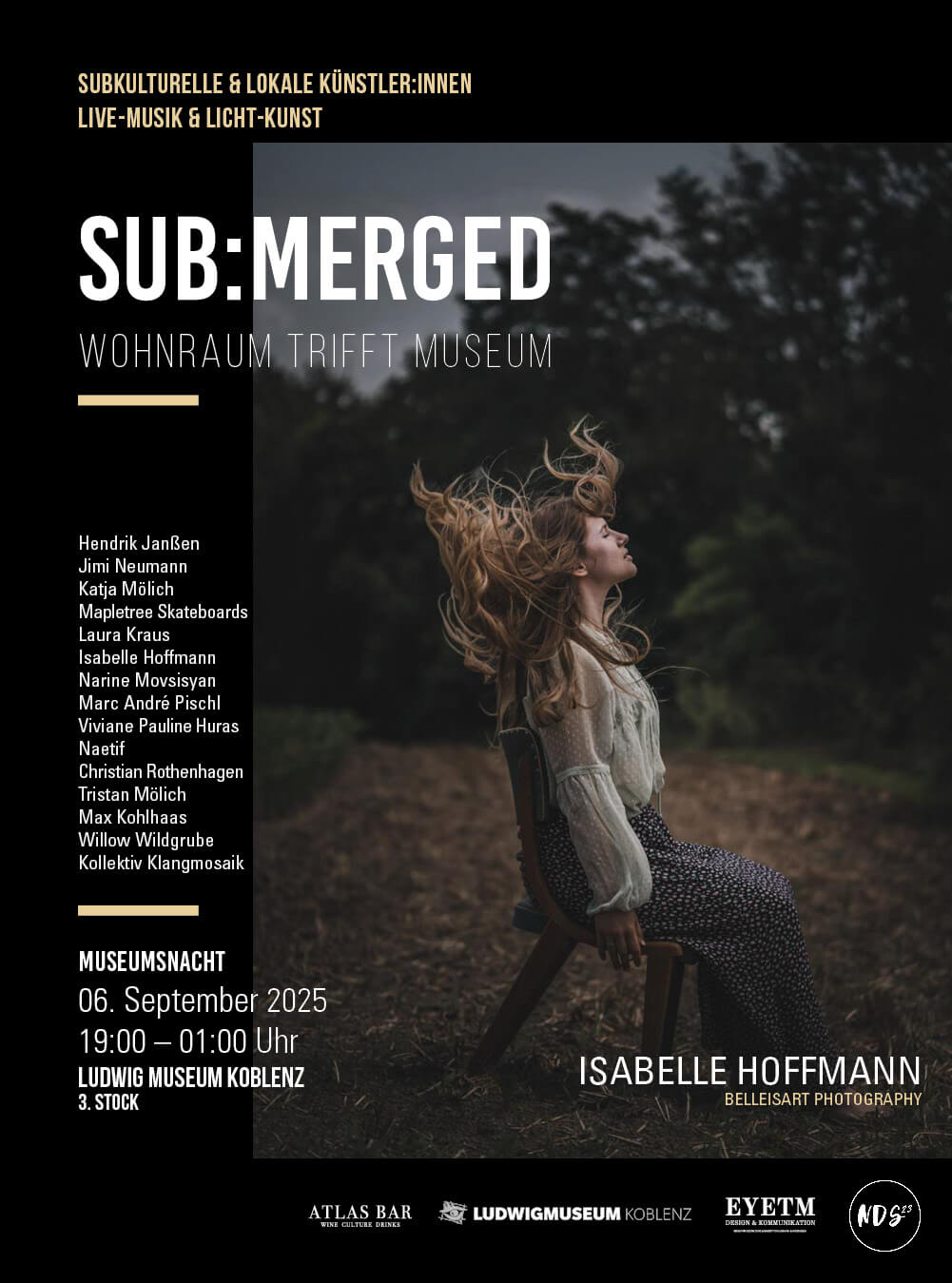 Zur Museumsnacht 2025 verwandelt sich der dritte Stock des Ludwig Museums Koblenz in eine vielschichtige Bühne für subkulturelle und lokale Künstler:innen. Unter dem Titel SUB:MERGED – Wohnraum trifft Museumverschmelzen verschiedene Ausdrucksformen wie Malerei, Fotografie, Glaskunst, Skulptur, Lichtkunst, Musik und Rauminstallation zu einer offenen, zugänglichen Ausstellung auf Zeit.
