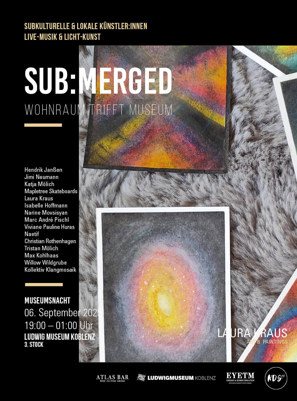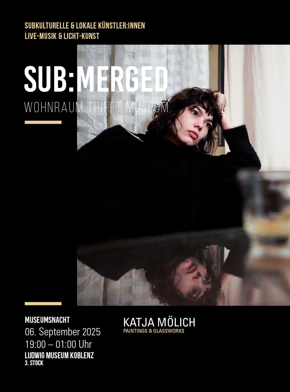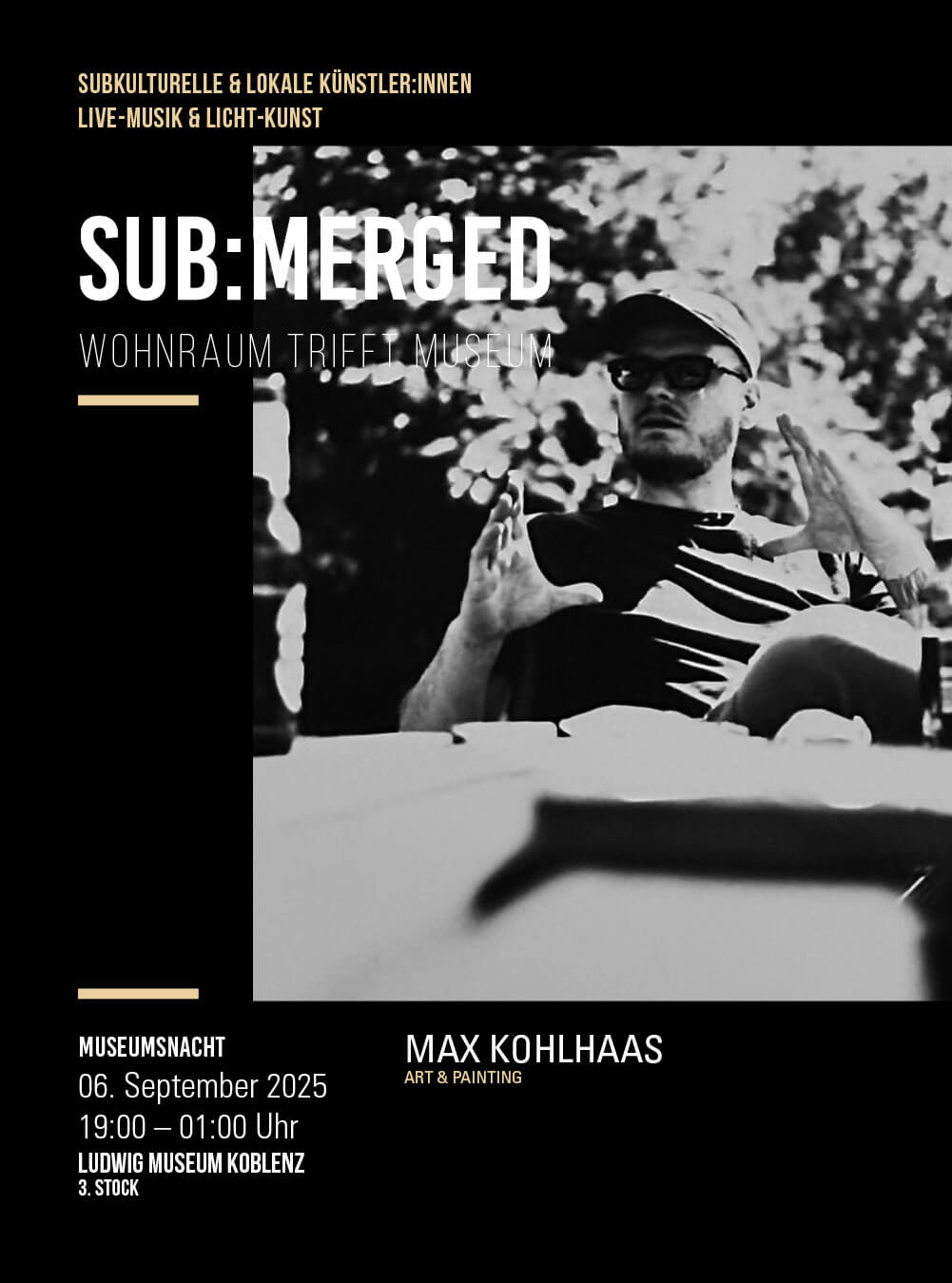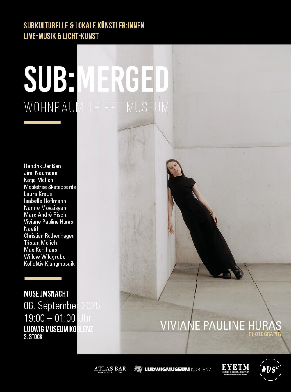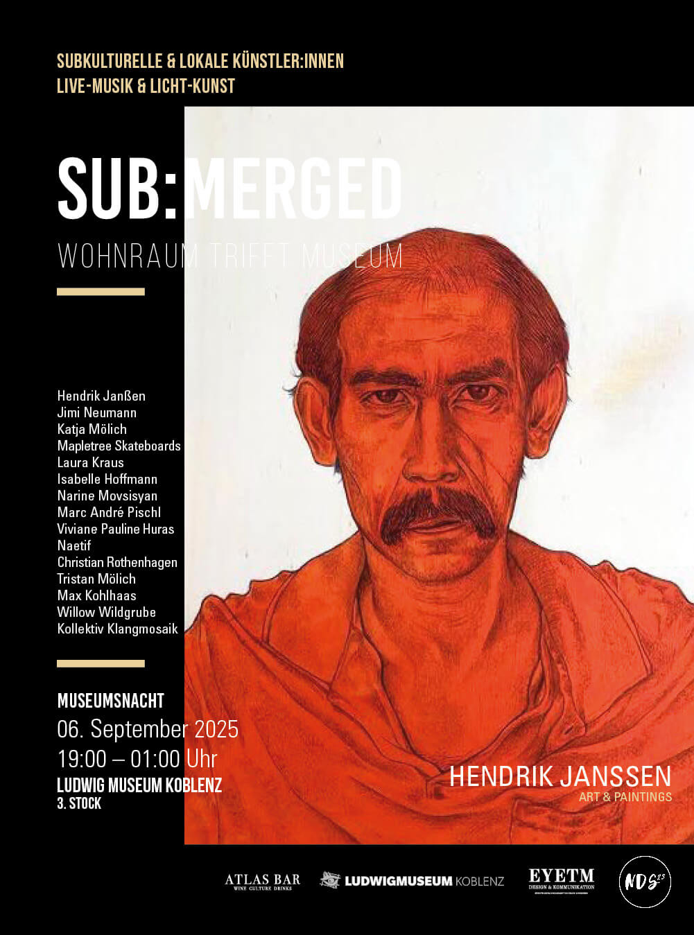 Zur Museumsnacht 2025 verwandelt sich der dritte Stock des Ludwig Museums Koblenz in eine vielschichtige Bühne für subkulturelle und lokale Künstler:innen. Unter dem Titel SUB:MERGED – Wohnraum trifft Museumverschmelzen verschiedene Ausdrucksformen wie Malerei, Fotografie, Glaskunst, Skulptur, Lichtkunst, Musik und Rauminstallation zu einer offenen, zugänglichen Ausstellung auf Zeit.