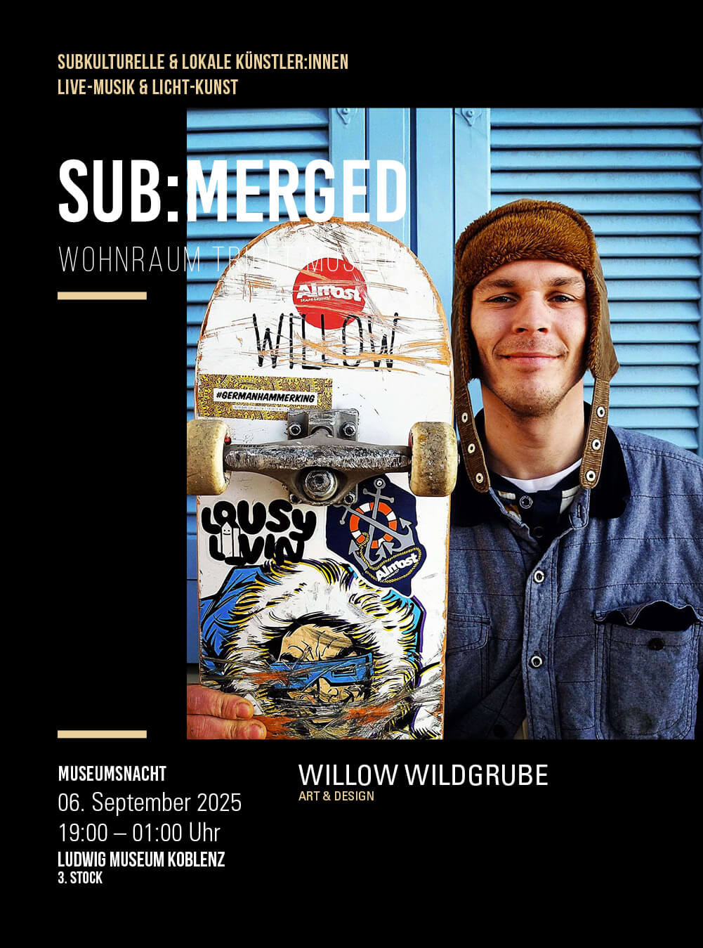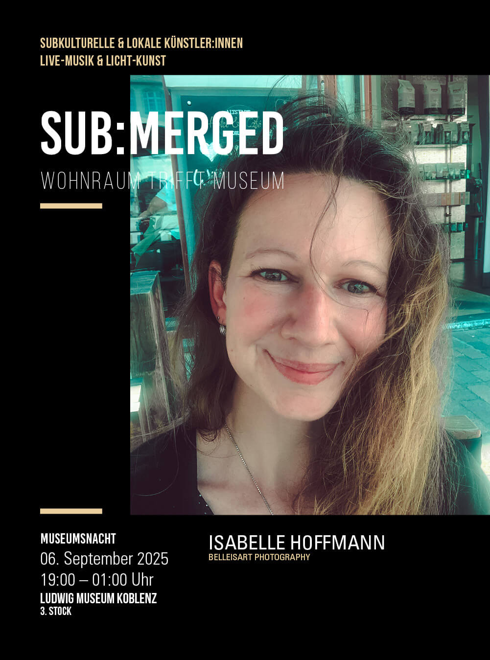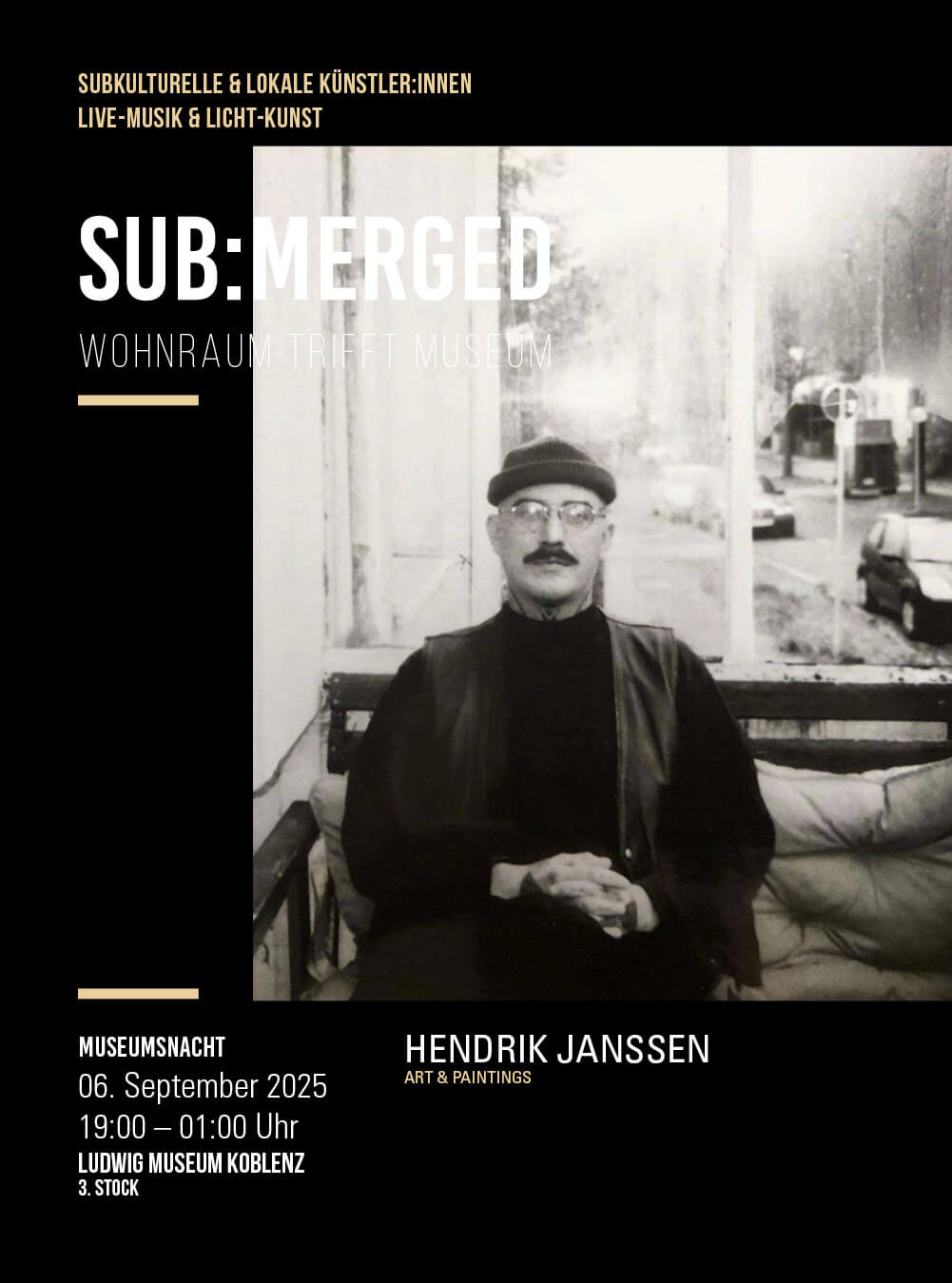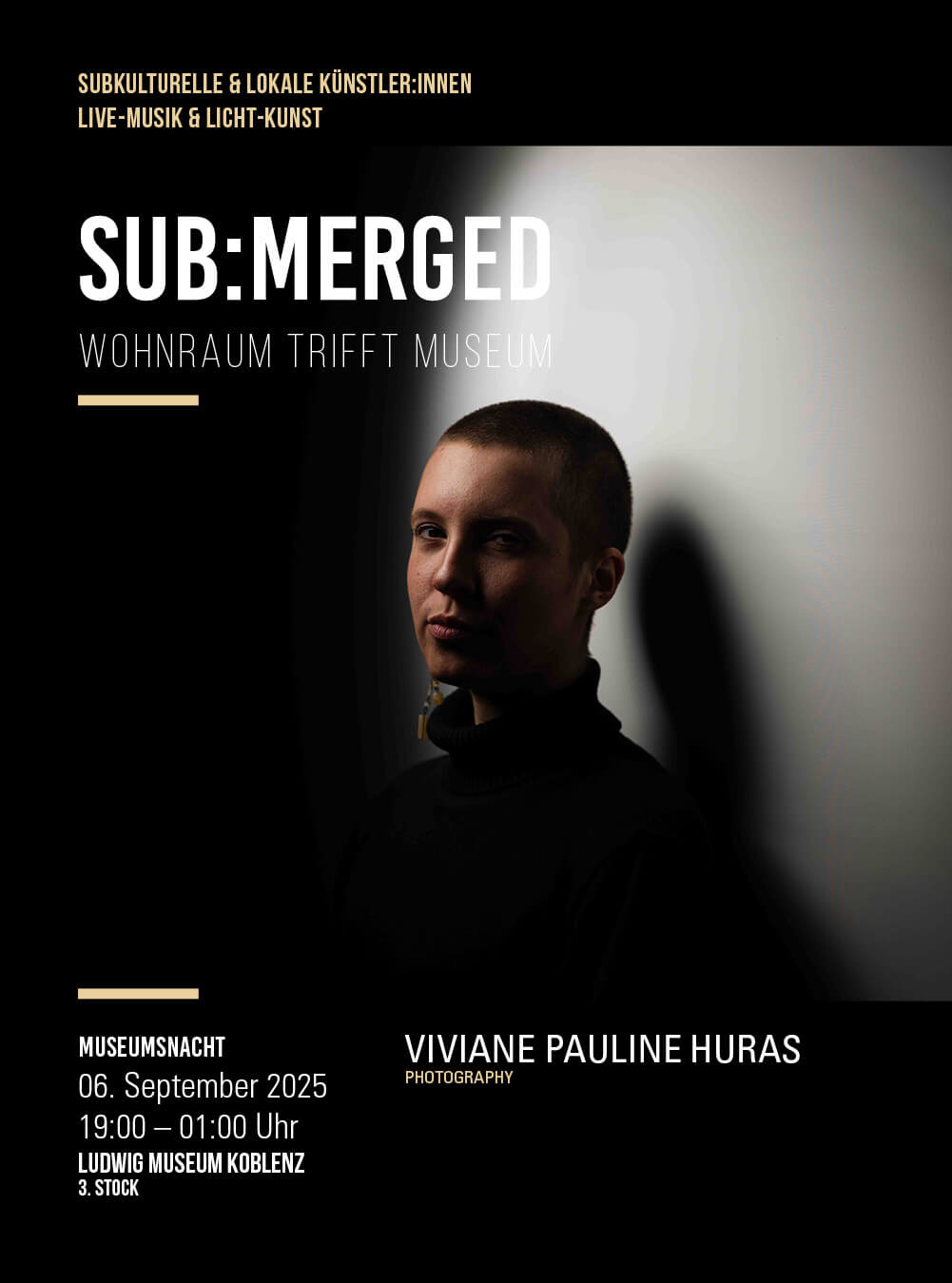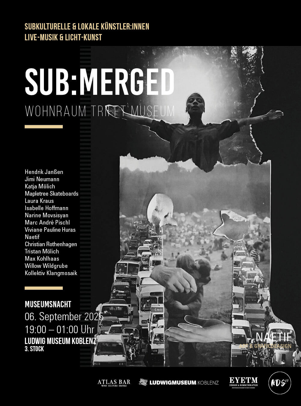 Zur Museumsnacht 2025 verwandelt sich der dritte Stock des Ludwig Museums Koblenz in eine vielschichtige Bühne für subkulturelle und lokale Künstler:innen. Unter dem Titel SUB:MERGED – Wohnraum trifft Museumverschmelzen verschiedene Ausdrucksformen wie Malerei, Fotografie, Glaskunst, Skulptur, Lichtkunst, Musik und Rauminstallation zu einer offenen, zugänglichen Ausstellung auf Zeit.