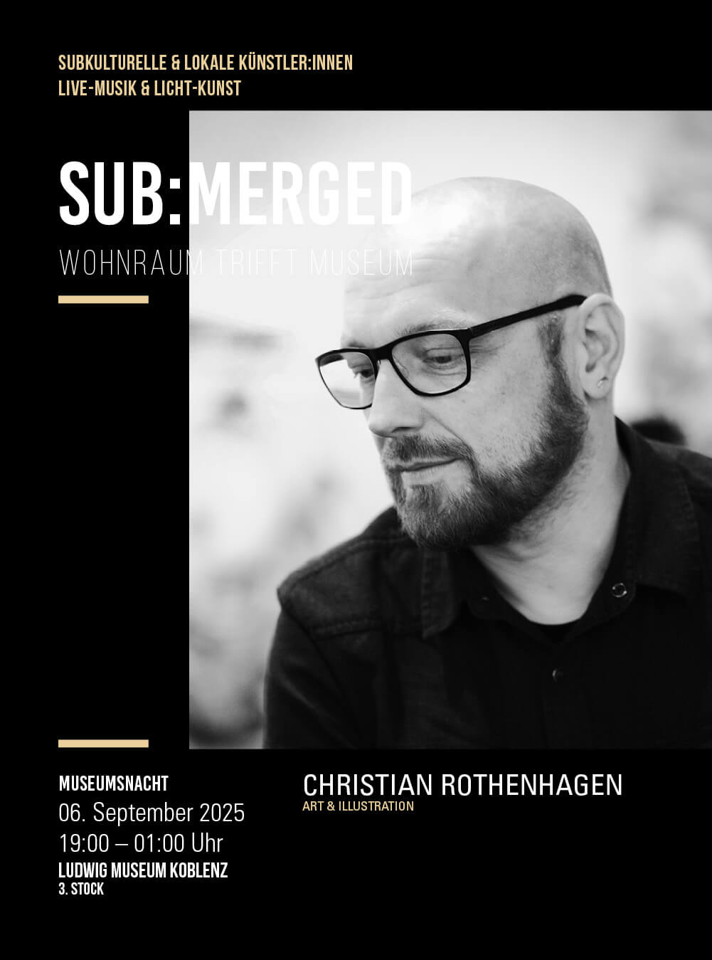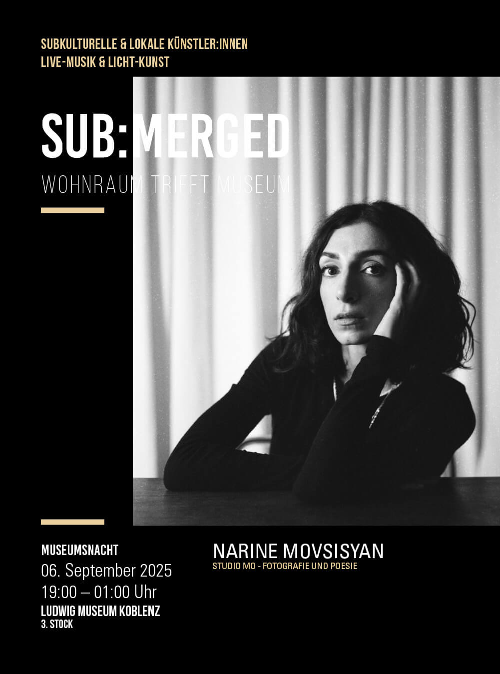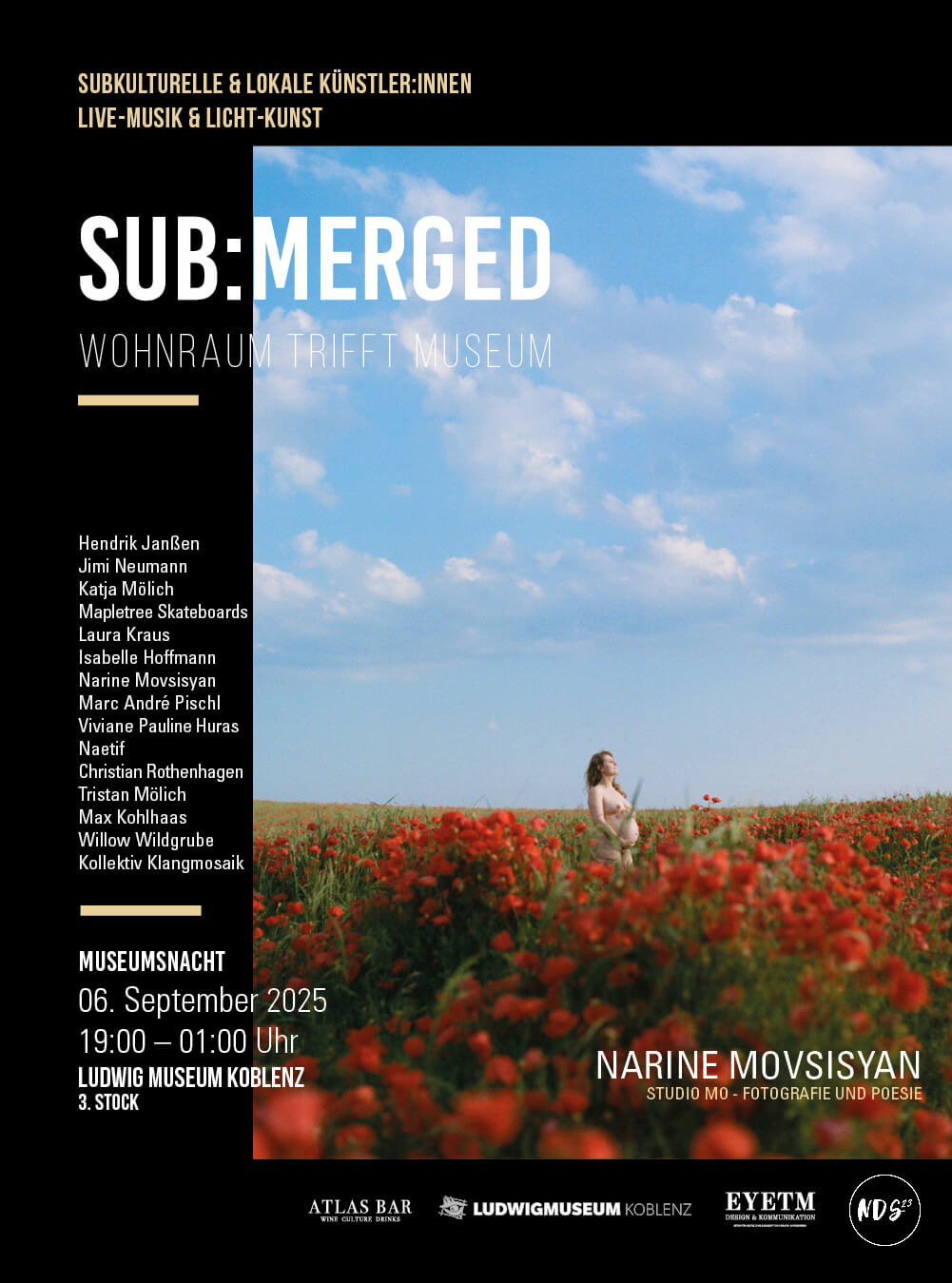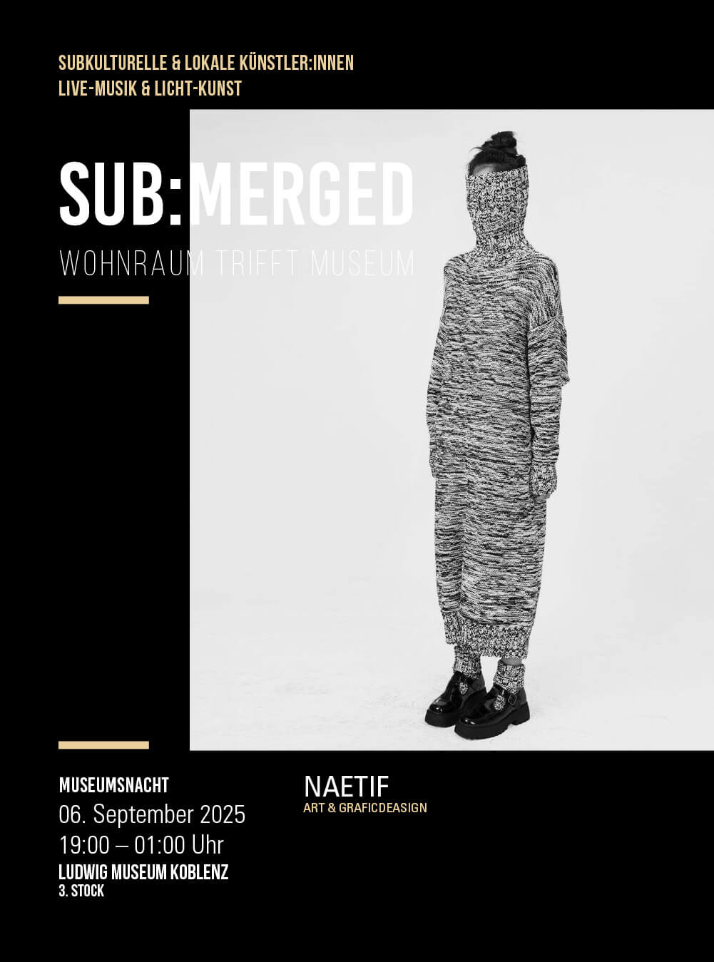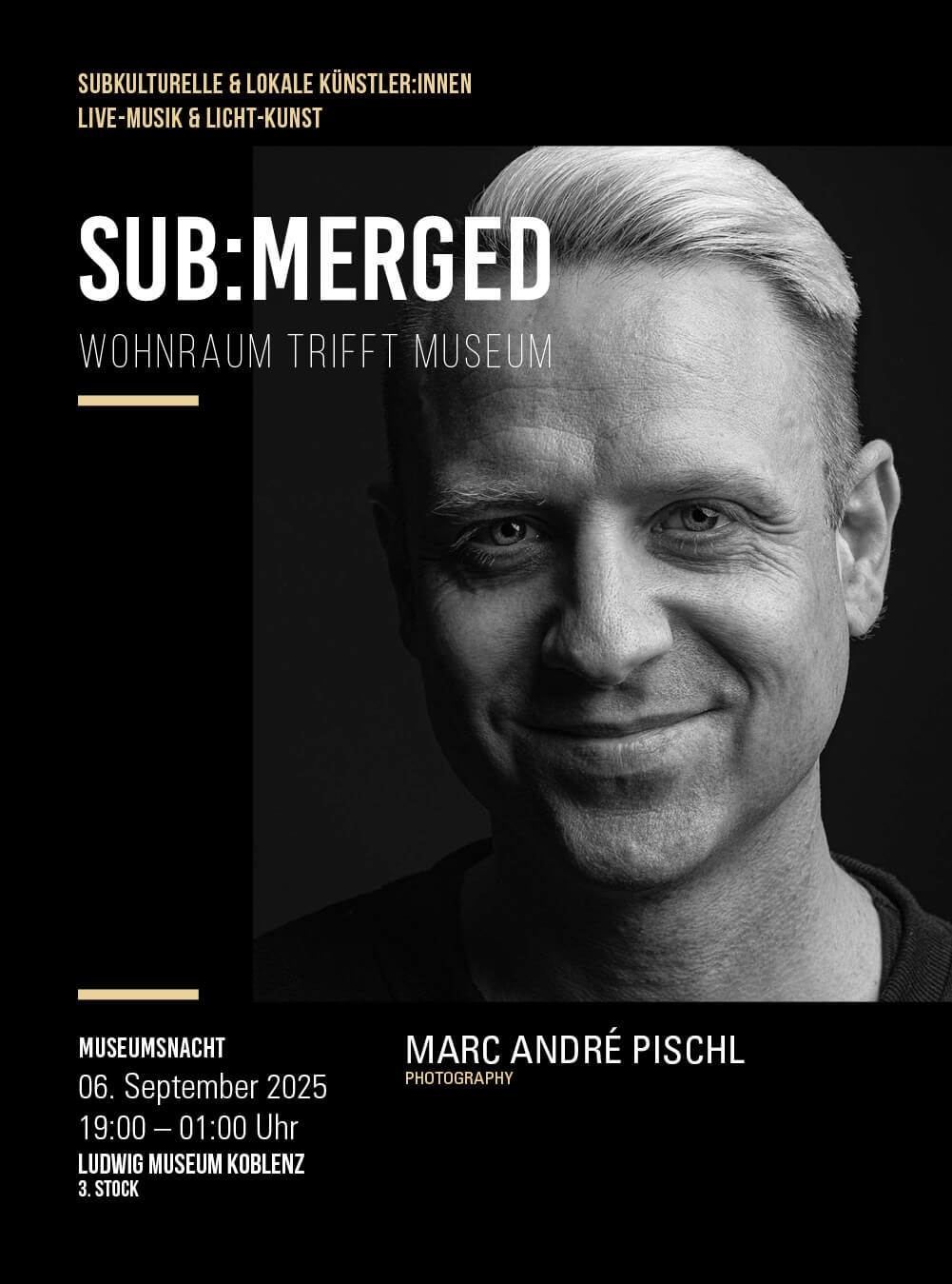 Zur Museumsnacht 2025 verwandelt sich der dritte Stock des Ludwig Museums Koblenz in eine vielschichtige Bühne für subkulturelle und lokale Künstler:innen. Unter dem Titel SUB:MERGED – Wohnraum trifft Museumverschmelzen verschiedene Ausdrucksformen wie Malerei, Fotografie, Glaskunst, Skulptur, Lichtkunst, Musik und Rauminstallation zu einer offenen, zugänglichen Ausstellung auf Zeit.